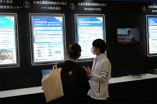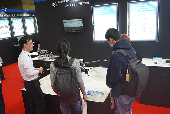 ルーチェサーチの「次世代通信システムを導入したドローンの開発」、MAZINの「次世代通信技術を使用した生産設備一括監視AIシステムの研究開発」には興味を示された来場者が多く、また朝日エティックの「IoTを用いた屋外広告物メンテナンスソリューション」にはとても興味を持たれた来場者の方が熱心に見学されるなど、展示内容についての解説やご質問への回答で共同研究先の社員の方や当センター職員が忙しく応対する盛況な状況になりました。